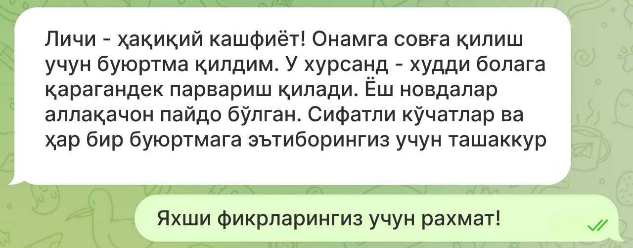 Мижозларимиз Хитойнинг Личи олхўриси экилиши ва илк ҳосили ҳақидаги таассуротлари билан ўртоқлашмоқда.